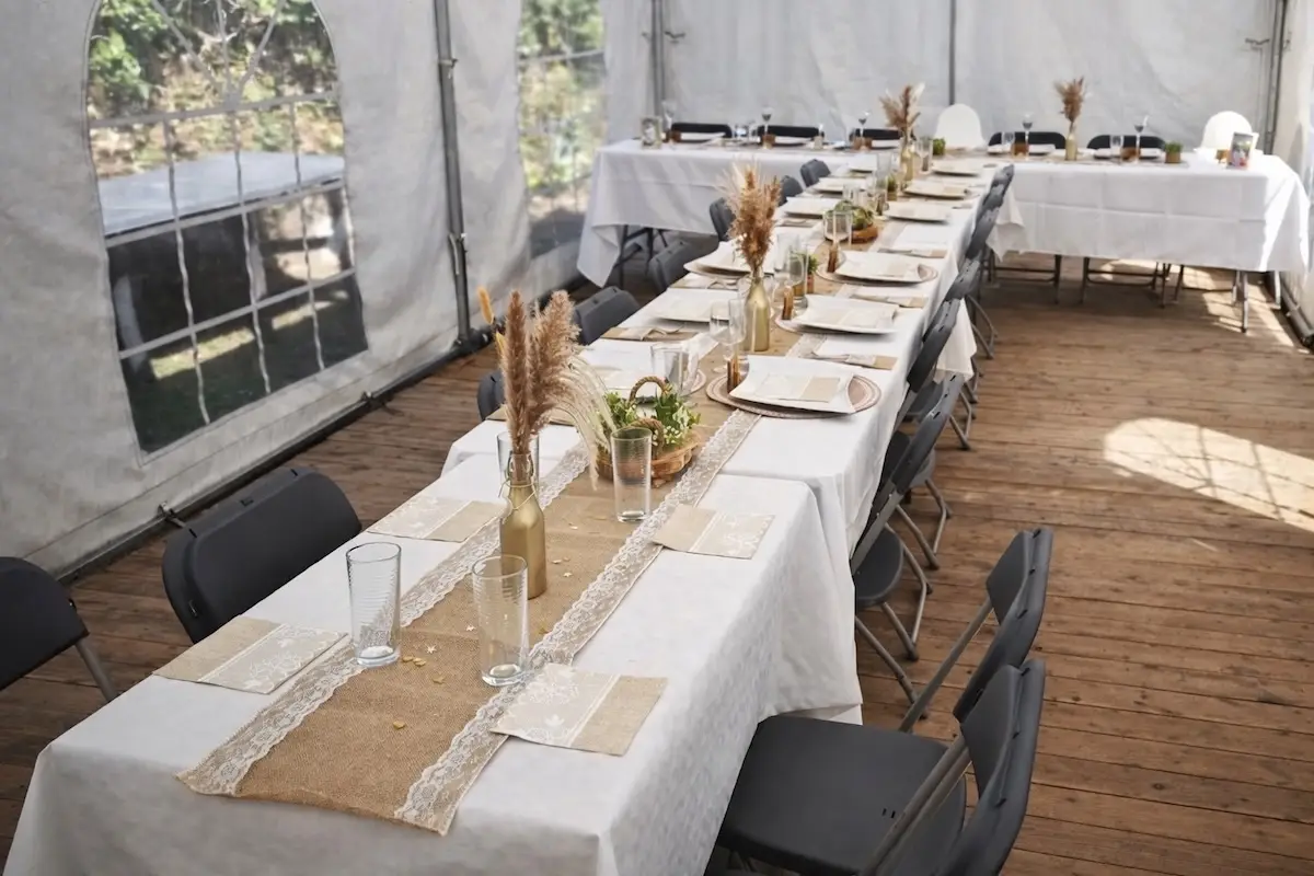 Nos chapiteaux modulables de 6 mètres de large s’adaptent facilement à votre jardin ou à votre terrain afin de créer un espace couvert confortable pour accueillir un plus grand nombre d’invités lors de votre événement.